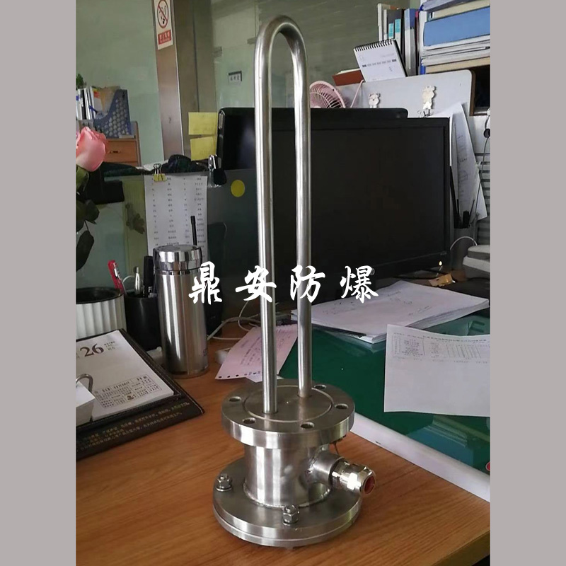 防爆法蘭電加熱管(也稱插入式電加熱器):是采用U型管狀電熱元件,依據加熱不同介質設計規范,按照功率配置要求裝配在法蘭蓋上,插入需加熱物料中,發熱元件工作時所發出的大量熱量傳導給被加熱介質使介質溫度升高,達到所需的工藝要求。當介質溫度達到工藝要求的設定值時,控制系統根據溫度傳感器信號,經PID 運算后調節電加熱器輸出功率,對發熱元件的電阻性負載實現溫度控制。使介質溫度均勻,達到所需要求;當發熱元件超溫或低液位時,發熱元件的聯鎖保護裝置立即切斷加熱電源避免發熱元件燒壞,延長使用壽命。