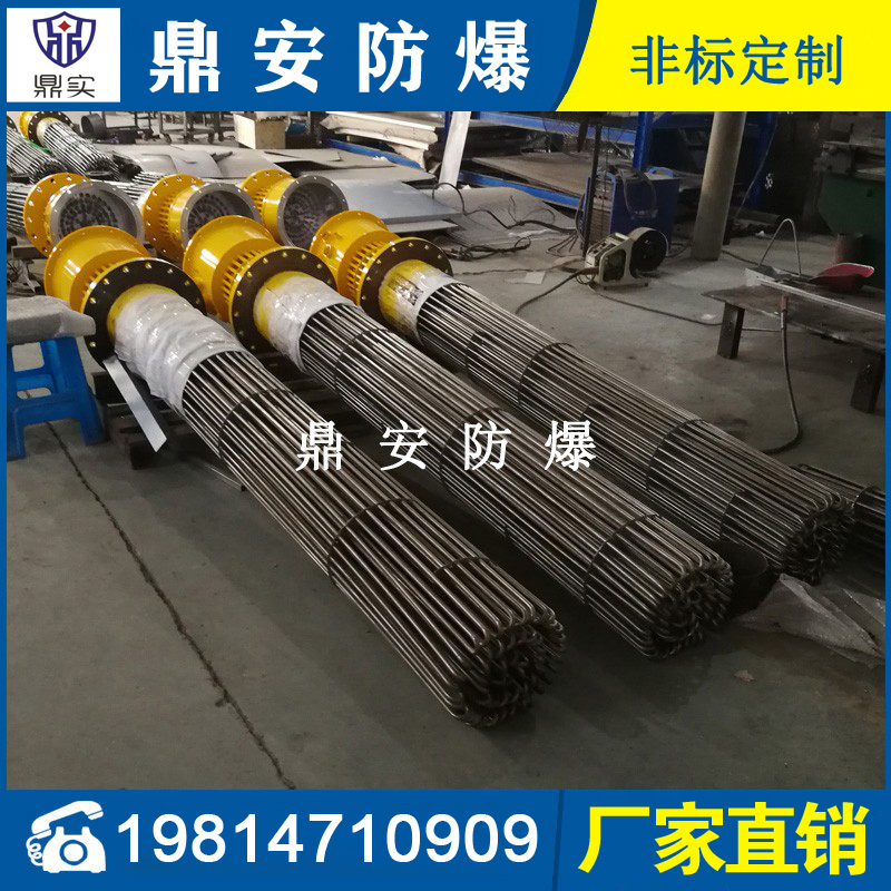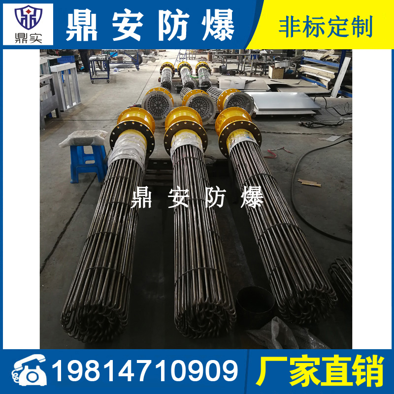 防爆法蘭式電加熱管按結構分大致可分為螺牙型和平板式法蘭型加熱器,常見的電壓:200V-220V-380V,功率按發熱根據發熱尺寸不同有:3KW-4.5KW-6KW-8KW-9KW-10KW-12KW-15KW-18KW-21KW等,通常由3-6-9支U型雙頭加熱管通過TIG氬弧焊接于法蘭組合而成。常作為鍋爐加熱器、槽體加熱器、模溫機加熱器等使用,廣泛運用于電子、塑膠、化工、環境工程的槽體-罐體-設備的加熱。螺牙型法蘭加熱器,常見的安裝螺牙(絲牙)尺寸有:1寸-1.5寸(M47*2.5)-2寸(M58*2.5)管螺牙;平板式法蘭型加熱器,常見的安裝法蘭標準有日標和國標兩種,大小有:DN32-DN40-DN50-DN65-DN80-DN100-DN125-DN150-DN200-DN250-DN350-DN400-DN450等,如日標JIS150 法蘭加熱器常見的壓力有6kg-10kg-16kg-25kg;