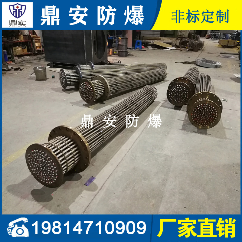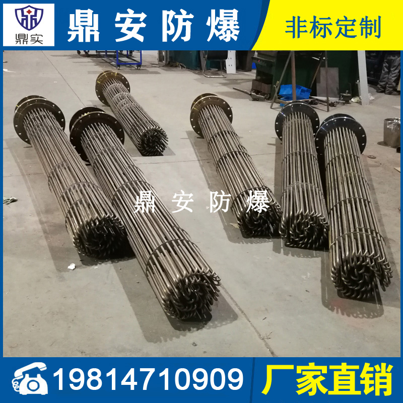 防爆法蘭加熱管是由多支加熱管焊接在法蘭上集中加熱。主要用于敞開式、封閉式的溶液箱和循環系統中加熱用。優點: 表面功率大,使一般電加熱表面負荷的2~4倍,高度密集式、結構緊湊。由于整體短而密集,故穩定性好,安裝無需支架。組合式法蘭加熱管大多采用氬弧焊接方式使電熱管于法蘭連接,也可利用緊固裝置的形式,即每支電熱管上焊由緊固件。然后與法蘭蓋采用螺母鎖緊。管子于緊固件采用氬弧焊接。漏緊固件密封處采用科學的工藝。單支更換方便,大大節約以后的維修成本選擇進口及國內優質材料。科學的生產工藝,嚴格的質量管理,保證電熱管優越的電氣性能。