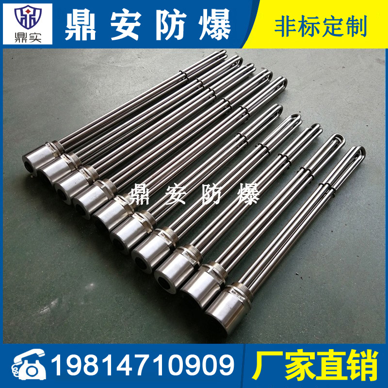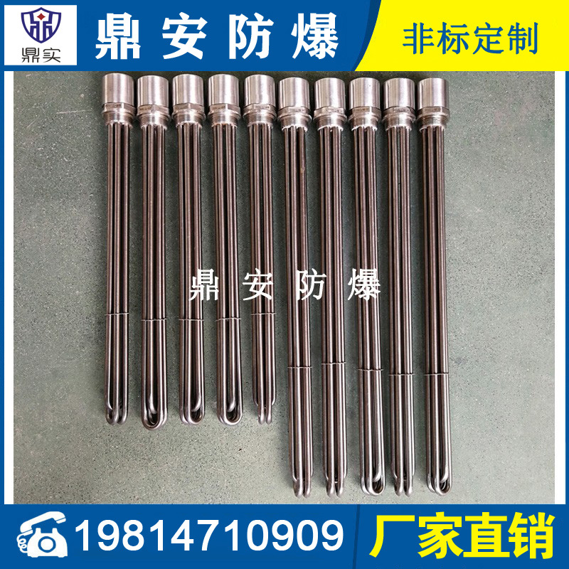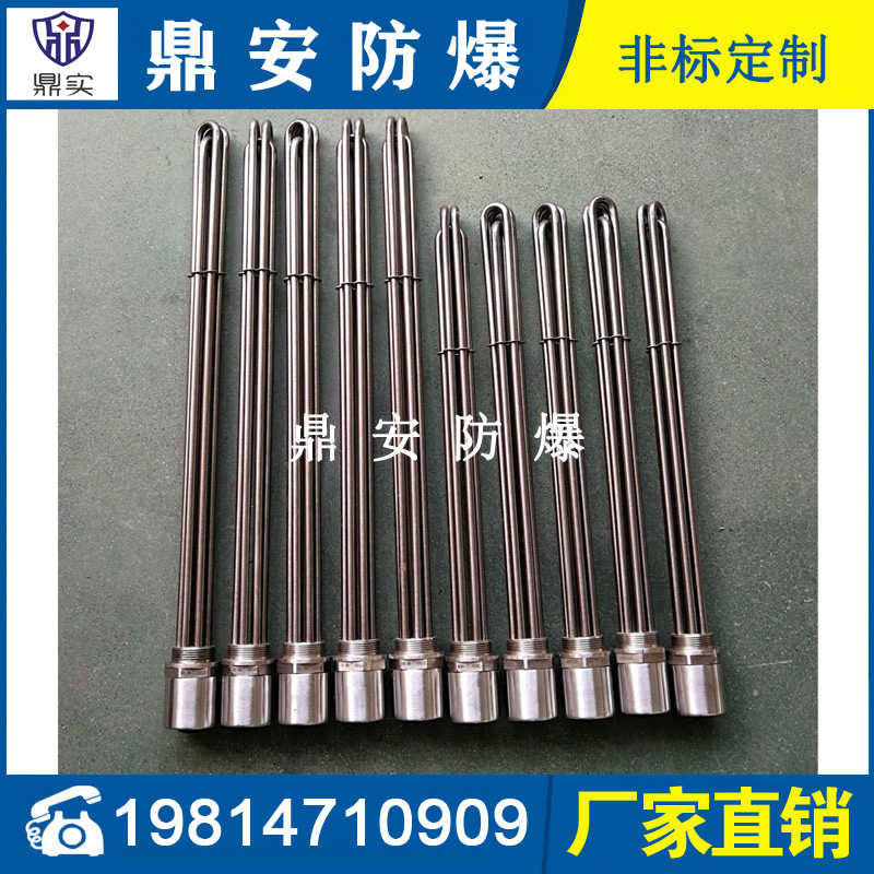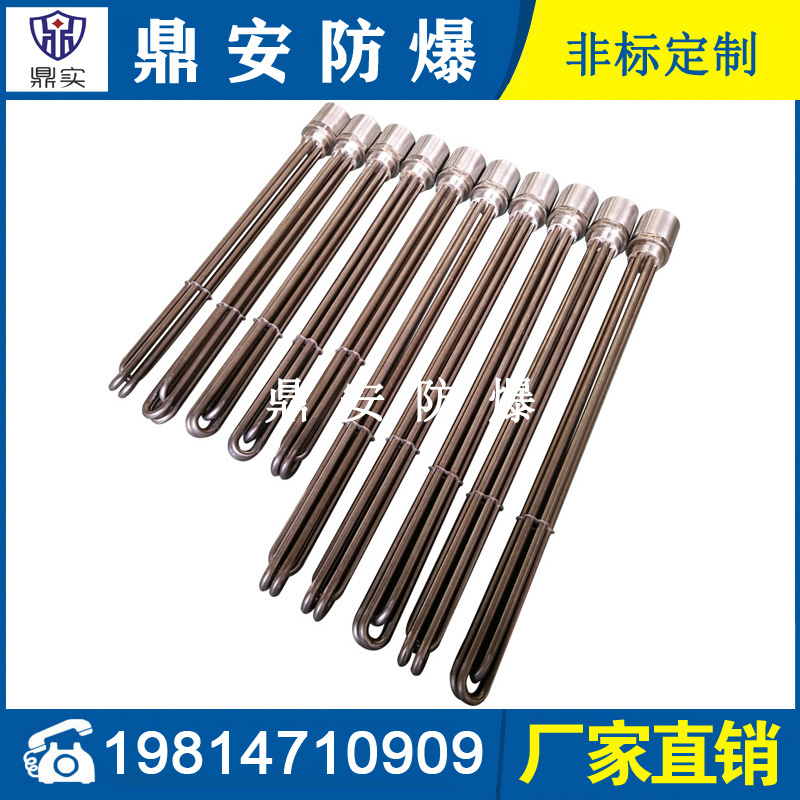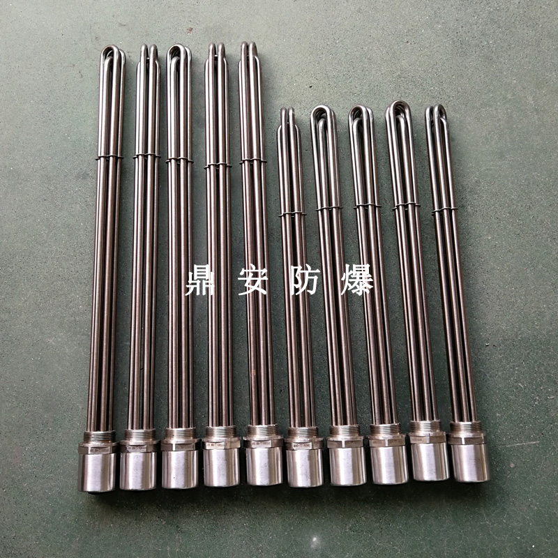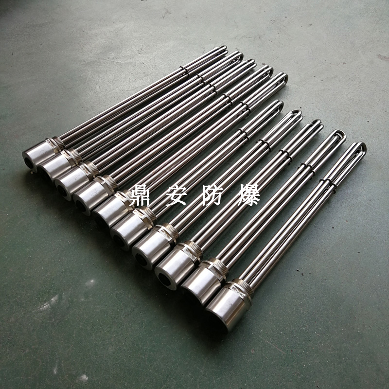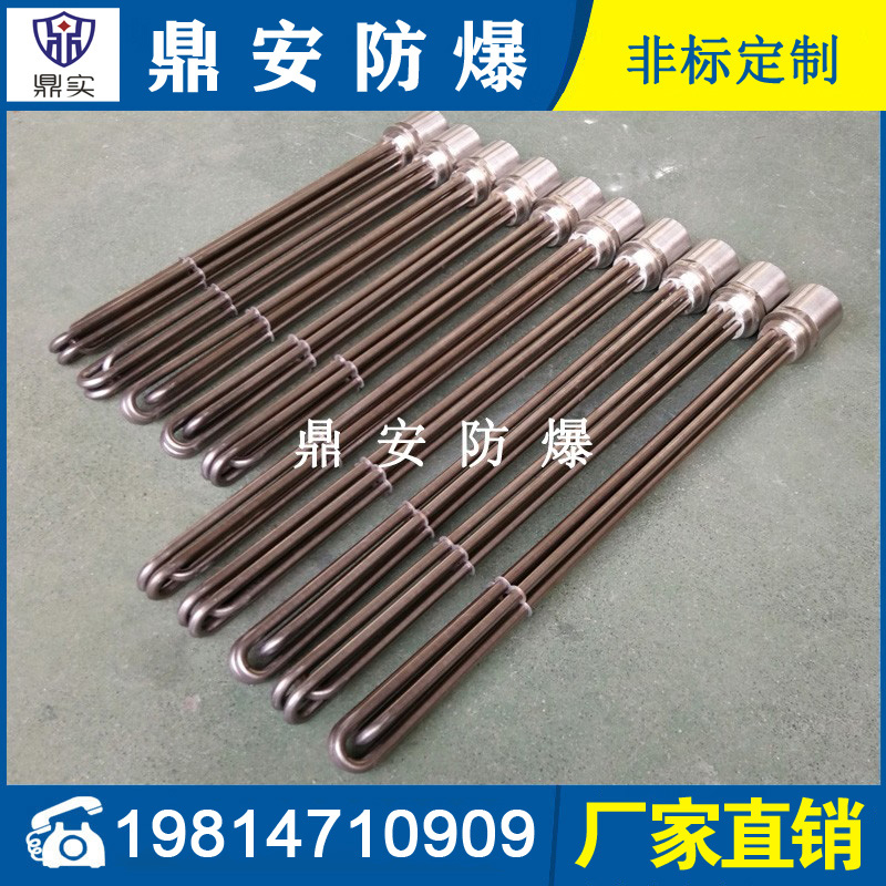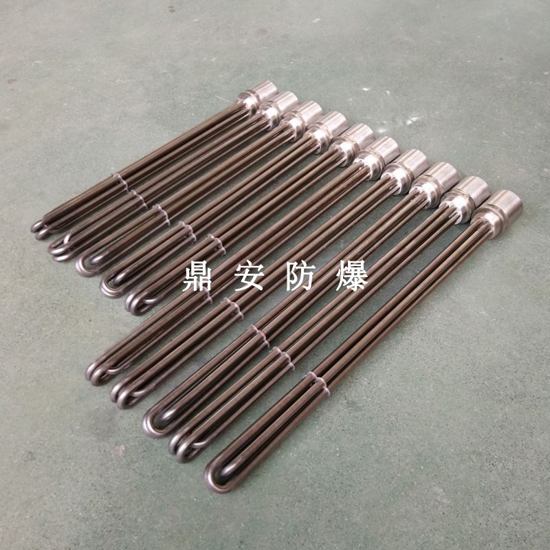 法蘭電熱管(也稱插入式電加熱器):是采用U型管狀電熱元件,多支U型電熱管焊接在法蘭上集中加熱,依據(jù)加熱不同介質設計規(guī)范,按照功率配置要求裝配在法蘭蓋上,插入需加熱物料中,發(fā)熱元件工作時所發(fā)出的大量熱量傳導給被加熱介質使介質溫度升高,達到所需的工藝要求,主要用于敞開式、封閉式的溶液箱和循環(huán)系統(tǒng)中加熱用。
