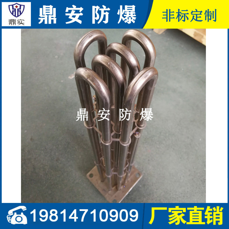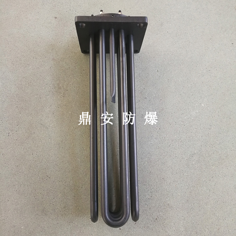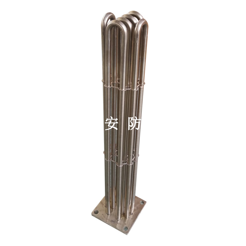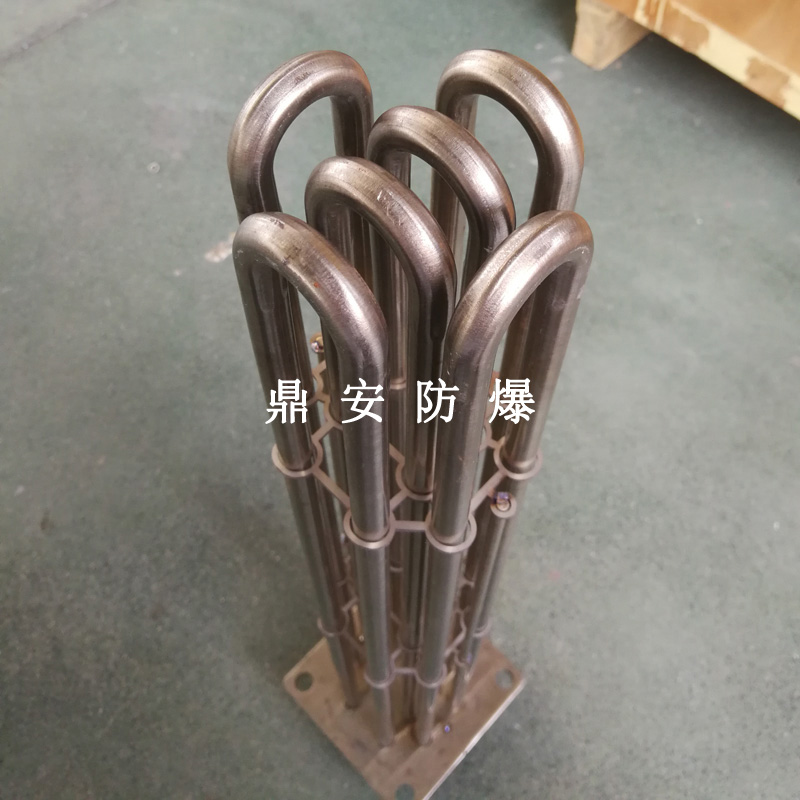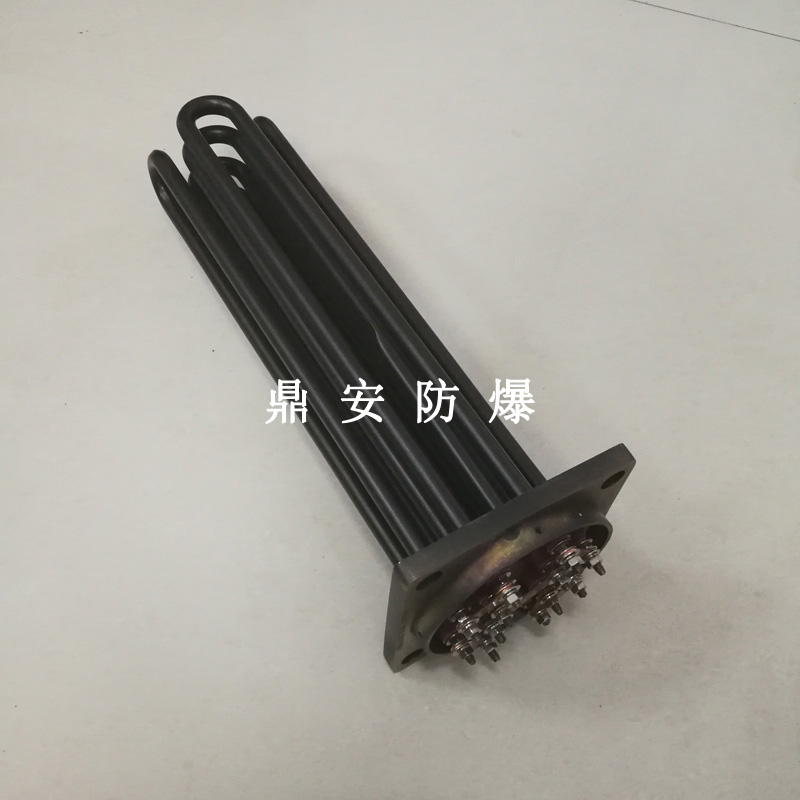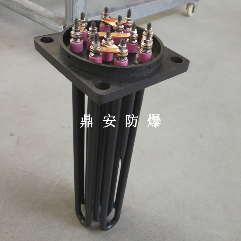 法蘭電熱管(也稱插入式電加熱器):是采用U型管狀電熱元件,多支U型電熱管焊接在法蘭上集中加熱,依據加熱不同介質設計規范,按照功率配置要求裝配在法蘭蓋上,插入需加熱物料中,發熱元件工作時所發出的大量熱量傳導給被加熱介質使介質溫度升高,達到所需的工藝要求,主要用于敞開式、封閉式的溶液箱和循環系統中加熱用。