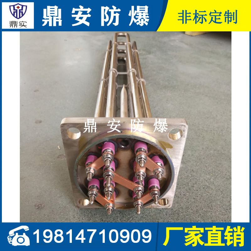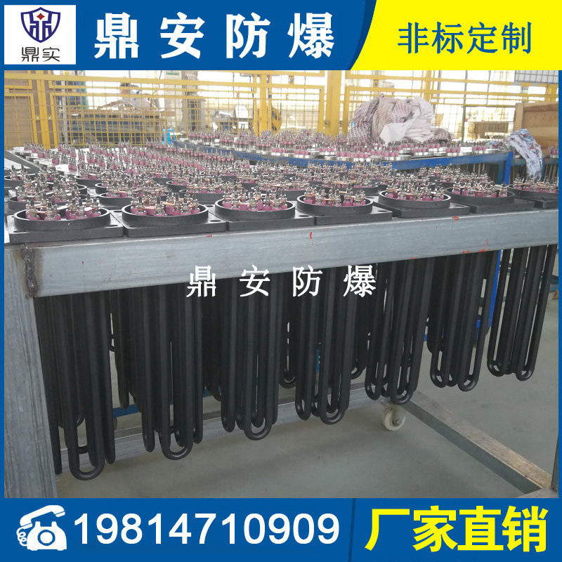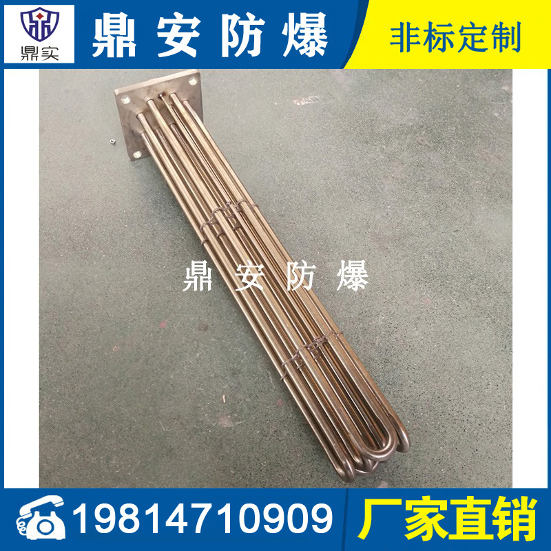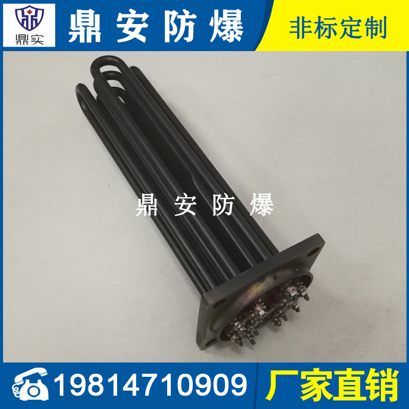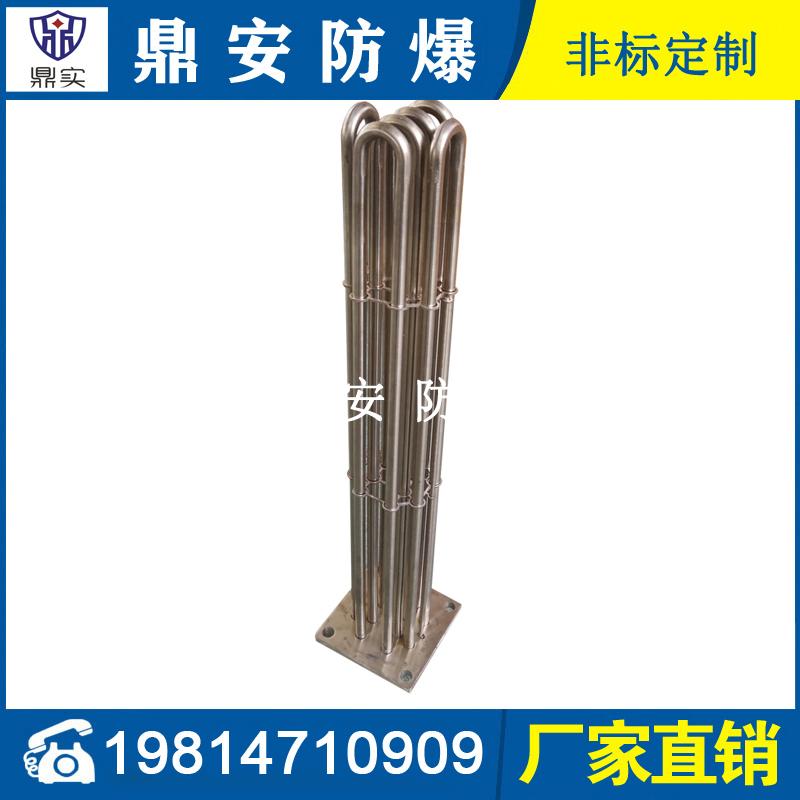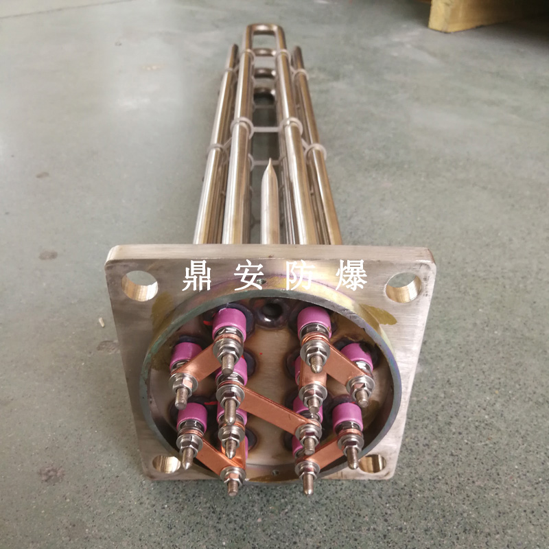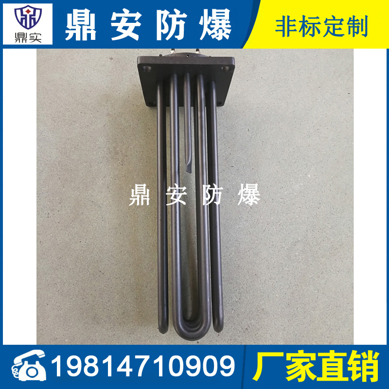 法蘭電熱管(也稱插入式電加熱器):是采用U型管狀電熱元件,多支U型電熱管焊接在法蘭上集中加熱,依據加熱不同介質設計規范,按照功率配置要求裝配在法蘭蓋上,插入需加熱物料中,發熱元件工作時所發出的大量熱量傳導給被加熱介質使介質溫度升高,達到所需的工藝要求,主要用于敞開式、封閉式的溶液箱和循環系統中加熱用。