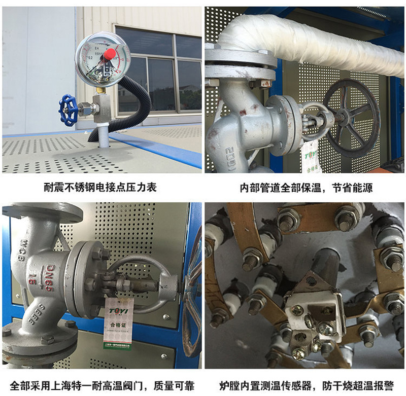 電加熱導熱油爐是將加熱元件直接插入有機載體(導熱油)中直接加熱,利用耐高溫循環泵,強制將導熱油進行液相循環,將導熱油吸收的熱量傳遞給用一個或多種用熱設備,經用熱設備把熱量卸載后,把導熱油重新通過循環泵,回到導熱油爐電加熱器加次加熱,再吸收量,傳遞給用熱設備,如此周而復始,實現熱量的連續傳遞,使被加熱物體溫度升高,達到加熱的工藝要求。