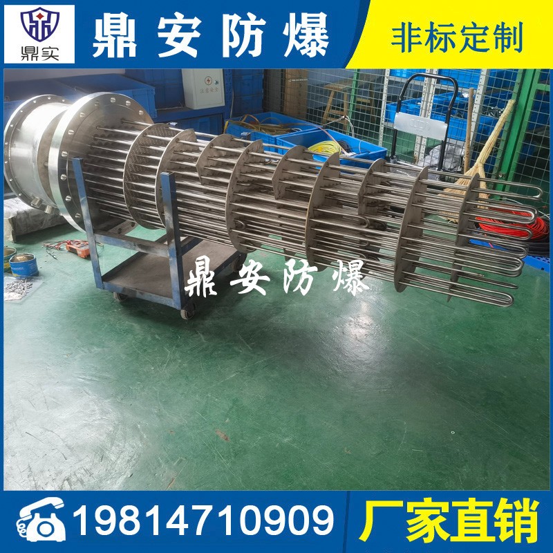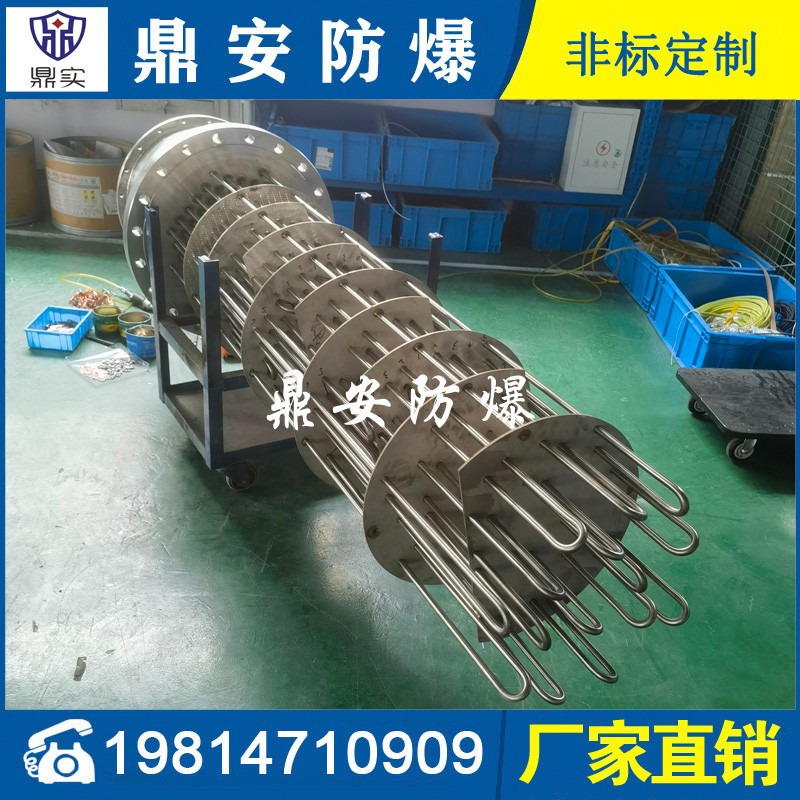 防爆法蘭式電加熱管按結構分大致可分為螺牙型和平板式法蘭型加熱器,常見的電壓:200V-220V-380V,功率按發熱根據發熱尺寸不同有:3KW-4.5KW-6KW-8KW-9KW-10KW-12KW-15KW-18KW-21KW等,通常由3-6-9支U型雙頭加熱管通過TIG氬弧焊接于法蘭組合而成。常作為鍋爐加熱器、槽體加熱器、模溫機加熱器等使用,廣泛運用于電子、塑膠、化工、環境工程的槽體-罐體-設備的加熱。螺牙型法蘭加熱器,常見的安裝螺牙(絲牙)尺寸有:1寸-1.5寸(M47*2.5)-2寸(M58*2.5)管螺牙;平板式法蘭型加熱器,常見的安裝法蘭標準有日標和國標兩種,大小有:DN32-DN40-DN50-DN65-DN80-DN100-DN125-DN150-DN200-DN250-DN350-DN400-DN450等,如日標JIS150 法蘭加熱器常見的壓力有6kg-10kg-16kg-25kg;